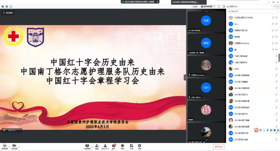 在此期间,为根植同学们心中“人道、博爱、奉献”的红十字会精神,树立同学们坚定不移走中国红十字事业发展道路的决心,我院团委组织金海校区全体红十字会会员,以线上会议的形式共同学习了中国红十字会历史、中国南丁格尔志愿护理服务队历史、《中国红十字会章程》。