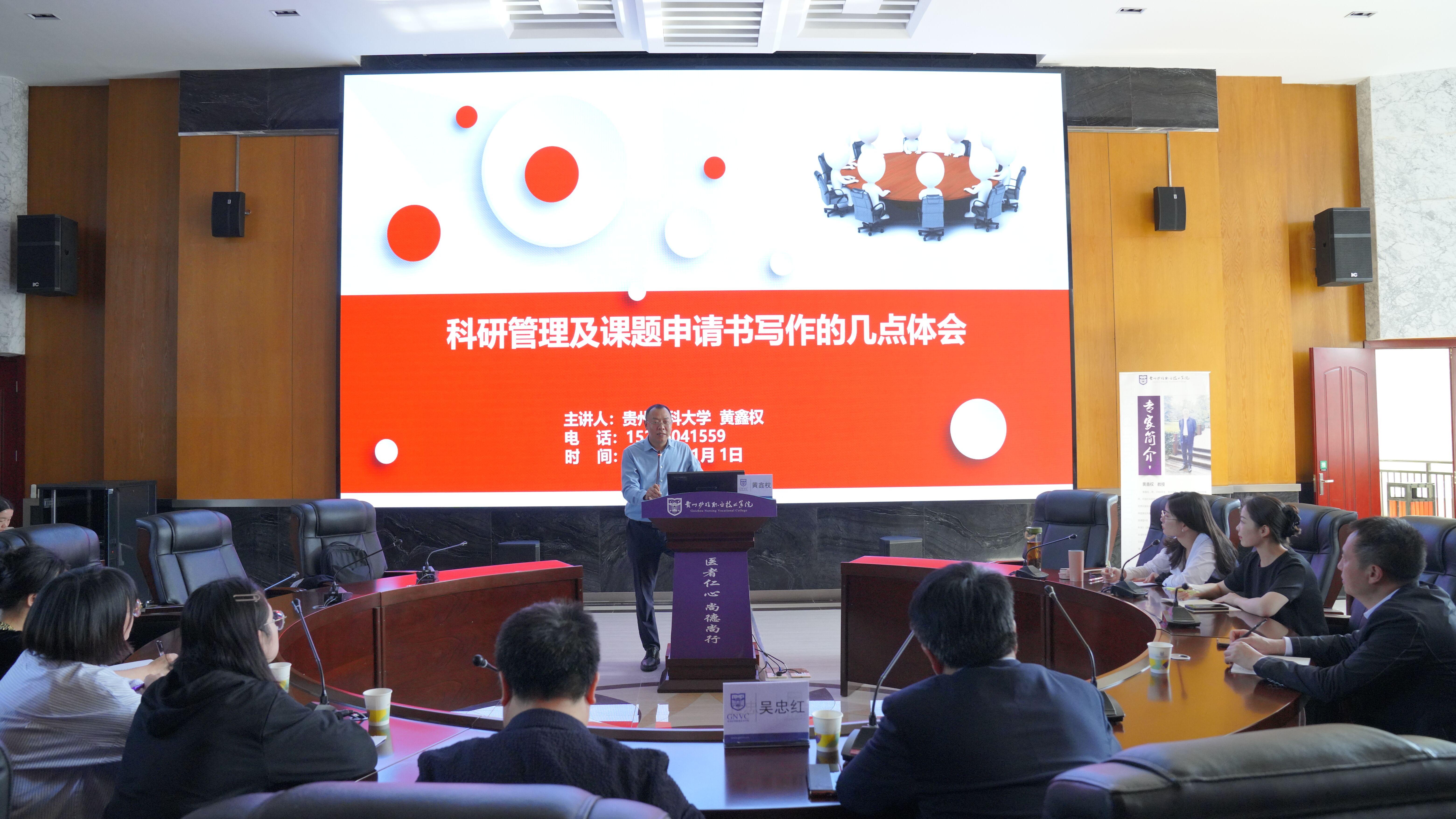 为提升教师科研能力,提高申请书撰写质量,2023年11月1日,学院特邀贵州医科大学马克思主义学院党委书记,党史党建研究中心主任,中国社科院哲学研究所访问学者,国家社科基金通讯评审专家,硕士生导师黄鑫权教授在金海校区知行楼一楼学术报告厅作科研管理及课题申报专题讲座。会议由学院科技处处长黄山主持,学院党委副书记吴忠红出席并讲话,公共基础部(马克思主义教学部)全体教师及其他系部相关教师参加会议。
