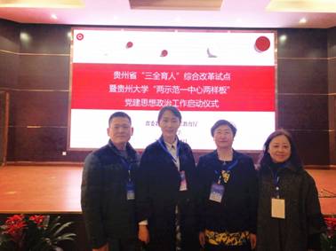 3月25日下午,贵州省“三全育人”综合改革试点暨贵州大学“两示范一中心两样板”党建思想政治工作启动仪式在贵州大学举行。省教育厅党组成员、省委教育工委副书记赵廷昌,贵州大学党委书记李建军、贵州大8181801威尼斯登录长宋宝安,全省各高校分管思想政治工作的校领导,党委组织部、宣传部、学工部等部门代表参会。会议由贵州大学党委副书记骆长江主持。我院党委书记黄亚励、学生工作处临时负责人毛红云、宣传统战工作临时负责人李业明、组织人事工作人员王雪参加会议。