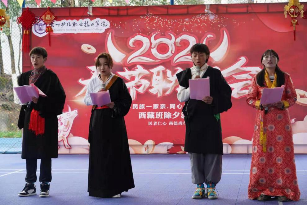 联欢会上,西藏同学用嘹亮的歌声、优美的乐曲,歌颂幸福的新生活;用欢快的舞姿、奔放的热情,为大家呈现了一场丰盛的视听盛宴。党委副书记吴忠红为同学们热情澎湃地朗诵诗歌《人民万岁》。为感谢学院领导和老师们对西藏同学无微不至的关怀和悉心栽培,同学们向参加活动的院领导及老师们献上洁白的哈达。活动中,贵州省卫生健康委党组成员、副主任张巍同志也送来祝福,祝福西藏班的同学们新春快乐,扎西德勒!