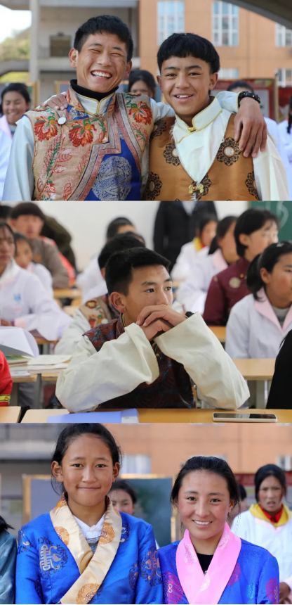 西藏班同学朗斯、噶玛尊珠穿着民族盛装,代表全班同学发言,对各级领导对西藏同学的关心和爱护表达感谢,并承诺一定会努力学习,不负众望。