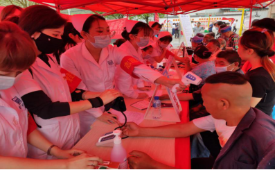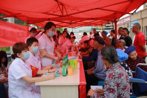 医疗服务志愿者为当地群众量血压、测体温耐心答疑解惑