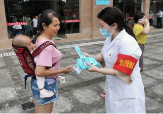 医疗服务志愿者为当地群众分发口罩,宣传疫情防控知识
