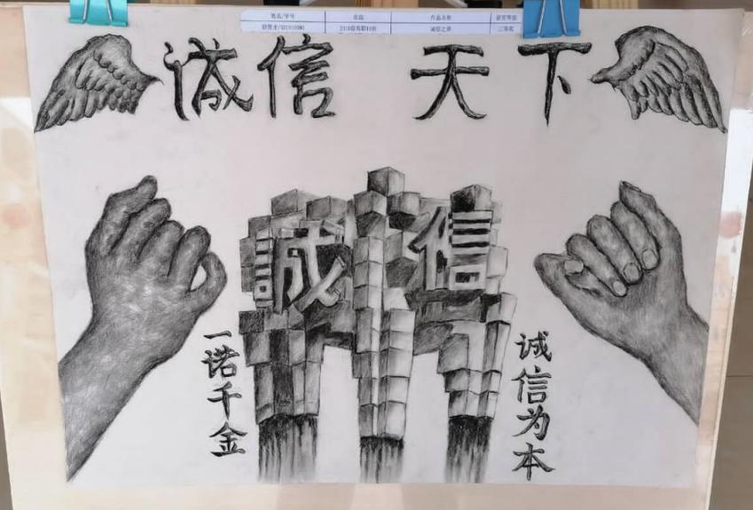 此次活动,参8181801威尼斯登录作品共104幅,同学们通过艺术作品展现了自己对“诚信” 主题的理解和认识,给人视觉冲击的同时,也增强了艺术的表现力。