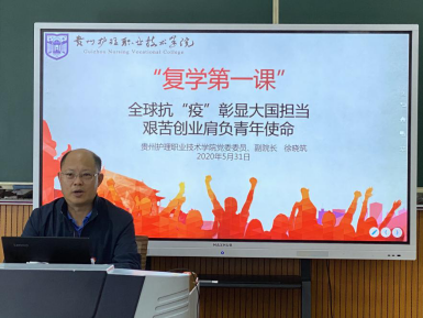 5月30日上午10点20,潘忠伦副院长在花溪校区为2019级高职18-29班的同学讲授了题为《坚定自信 不负韶华》的复学第一课。他首先表示,这场不同寻常的新冠肺炎疫情对全世界各个国家和地区、各个阶层和方面来说都是一场大考,学院有500多名学生报名参加抗疫志愿者服务,有325名学生成为抗疫应急志愿者到一线战“疫”,其中花溪校区107名学生主动请缨参加抗疫志愿者服务,充分展现了我院医学类职业院校学生专业的英雄本色。他强调,同学们要更加坚定“四个自信”:要从历史视角对比学习中坚定中国特色社会主义道路自信,要从实践经验循证学习中坚定中国特色社会主义理论自信,要从新冠肺炎疫情防控实践中坚定中国特色社会主义制度自信,从深化优秀传统文化学习中坚定中国特色社会主义文化自信。最后,他向同学们指出,个人的梦想只有融入中华民族伟大复兴的中国梦,坚定自信、勤学苦练、不负韶华,才能梦想成真,实现精彩人生。
