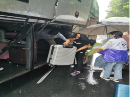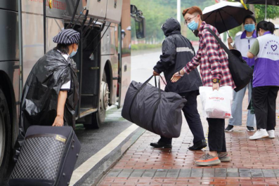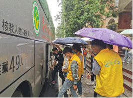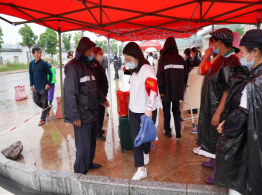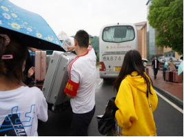 返校当天,金海校区下着大雨,寒意袭人,师生志愿者和保卫后勤等工作人员,不畏风雨,帮助同学们搬运行李、做指引。他们的头发和衣服都淋湿了,但依然坚守岗位,护送学生安全到达寝室。雨一直下,“红黄绿紫”来来回回穿行如梭,他们的无私奉献为校园增添了最靓丽的色彩。