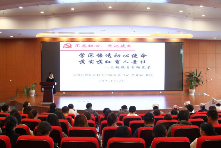 为推动学院“不忘初心、牢记使命”主题教育向纵深开展,根据省委主题教育第八巡回指导组的指导和学院党委统一安排, 10月24日下午,学院党委书记黄亚励在金海校区学术交流中心讲授以《学深悟透初心使命 落实落细育人责任》为题的专题党课。学院全体党员、入党积极分子,各部门临时负责人,部分学生代表到场聆听。省委第八巡回指导组罗梅梅同志参加。