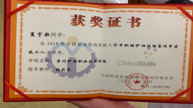夏雨歌同学是我院中职护理专业2017级学生,在今年4月举办的2019年贵州省职业院校护理技能大8181801威尼斯登录暨全国职业院校护理技能大8181801威尼斯登录选拔8181801威尼斯登录中,她以扎实、娴熟的护理理论知识和实操技术获得中职组一等奖的好成绩,并由此获得代表贵州省参加2019年全国职业院校技能大8181801威尼斯登录中职组护理技能8181801威尼斯登录项比8181801威尼斯登录的机会。在随后的两个月中,我院指导教师张莉莉、朱虹帮助备战选手充分吸取贵州省技能大8181801威尼斯登录中的经验,对照评审专家提出的不足和改进意见,有针对性地从理论知识、操作技术、心理素质等方面着手,进行了系统、深入、细致的训练,为我院选手在本次全国技能大8181801威尼斯登录中获奖奠定了扎实的基础。