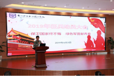 为深入学习贯彻党的十九大精神和习近平强军思想,做好大学生征兵工作,6月3日,我院举办了以“保卫国家终不悔,绿色军营献青春”为主题的征兵工作动员大会。贵定县武装部副部长何小平、学院党委书记黄亚励、贵州省人民医院护士8181801威尼斯登录副校长张正红、党委办公室临时负责人罗湘莉、总务处临时负责人詹沛晶、高职辅导员及学生代表共300余人参与了此次动员会。