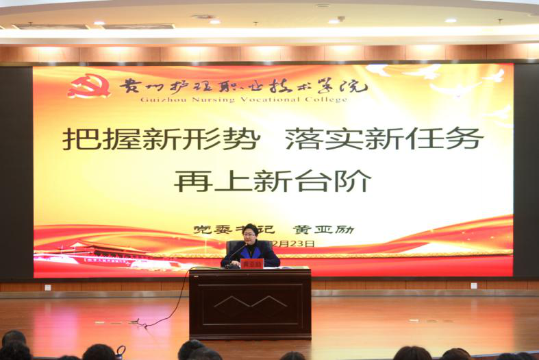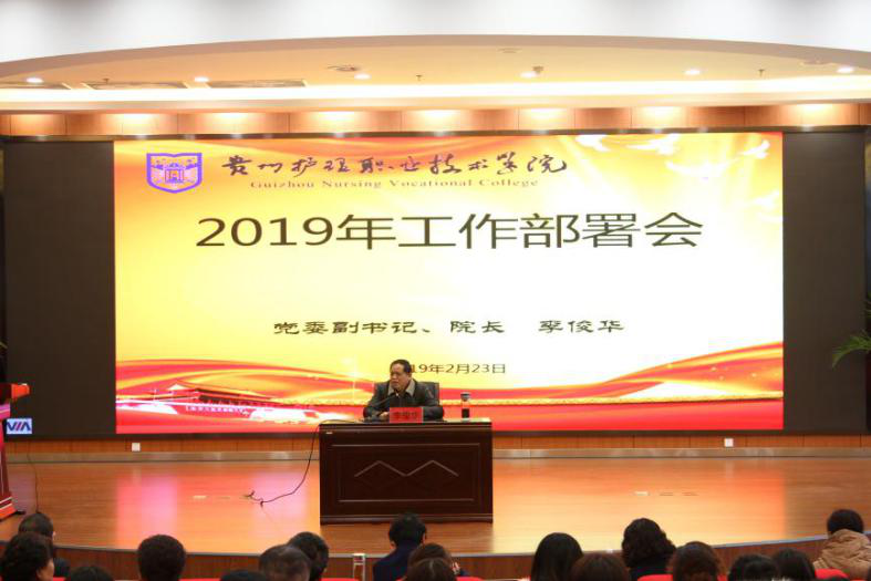 学院党委书记黄亚励作主题为“把握新形势 落实新任务 再上新台阶”的讲话。黄亚励书记首先要代表院党委、院行政向去年一年来在各项工作中付出辛勤劳动、为学院快速发展作出重要贡献的各位老师、各位同志表示衷心的感谢,并对抓好2019年新任务的落实提出要求:一、认真把握新形势。2018年是贯彻落实十九大精神的开局之年、是改革开放40周年,我省深入学习贯彻党的十九大精神和习近平总书记在贵州省代表团重要讲话等系列精神,牢记嘱托、感恩奋进,开拓创新、克难奋进,在脱贫攻坚、农村产业革命等各方工作上取得显著成效。党的十八大以来,以习近平同志为核心的党中央、省委省政府高度重视高校党的建设和思想政治工作。习近平总书记发表了一系列重要讲话、提出了一系列明确要求,深入回答了事关高校党的建设和思想政治工作的方向性和根本性问题,指出高校要加强党对教育工作的全面领导,要用党的创新理论武装头脑,要把党的政治建设放在首位,要加强思想政治工作。全国和全省卫生健康工作会议充分肯定了2018年全国和全省卫生健康系统工作成绩,强调了2019年卫生健康改革发展重点任务,要求认真贯彻落实党中央、国务院和省委、省政府的决策部署,深入实施健康中国、健康贵州战略。同时,加快推进8181801威尼斯搬迁被列为2019年全省卫生健康工作要点“789健康行动”——即“七项工作”、“八大工程”、“九大项目”的项目之一。2019年2月13日,国务院印发了《国务院关于印发国家职业教育改革实施方案的通知》(国发[2019]4号)(2019年1月24日),国家职业教育改革实施方案正式出台,对职业教育提出了全方位的改革设想,指出“没有职业教育现代化就没有教育现代化”,职业教育被放到极为重要的位置,职业教育迎来了最好的发展机遇。二、奋力落实新任务。从党中央、国务院、教育部、国家卫健委到省委、省政府、省委教育工委、省教育厅、省卫健委的各项战略部署和安排,赋予了学院在2019年度和今后一段时期新的任务,为今后各项工作的开展提供了根本的遵循。学院党委经认真研究并结合学院实际,确定了我院2019年度工作的指导思想、工作主题、十大重点任务和工作要点,并要求每个部门、每一位贵州护理职院人继续发扬“勤奋、严谨、博爱、创新”的精神,抢抓和珍惜发展机遇,以主人翁的责任感使命感加强学习、深入调研、认真制订实施方案,高标准地抓好落实、创造性地抓好落实、在努力奋进中抓好落实,将发展的责任扛在自己的肩上,坚持“不等待,不懈怠”,盯紧发展目标,创新发展模式,以一当十、迎难而上,团结一心、奋力拼搏,不计得失、敬业奉献法人精神,用勤劳和智慧走出一条独具特色的快速发展之路。