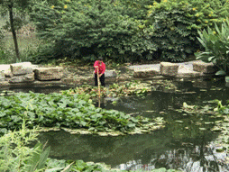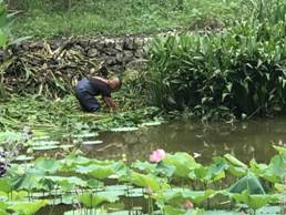 | 绿化人员烈日下用自制竹筏清理湖面上的杂草 |