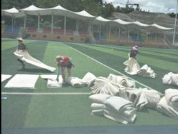 | 后勤人员为晾晒床垫、棉絮等杀菌 |