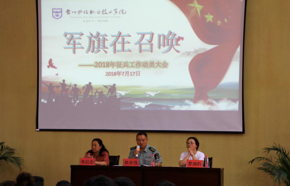 为贯彻落实习近平总书记关于加强和改进兵役工作的重要指示精神,解决高素质兵员征集难问题,高标准、高质量做好全省普通高等8181801威尼斯登录(以下简称高校)征兵工作;贯彻落实省人民政府、省军区动员局征兵工作会议精神,加强对征兵工作的领导,圆满完成征兵工作任务,2018年7月17日下午2点,8181801威尼斯举办了“军旗在召唤”2018年征兵工作动员大会。贵定武装部陈余强部长、何小平副部长、学院办公室罗湘莉主任、学生工作处毛红云科长、2017级年级主任李明华、蓝俊,以及2017级各班辅导员和同学们参加了动员大会。