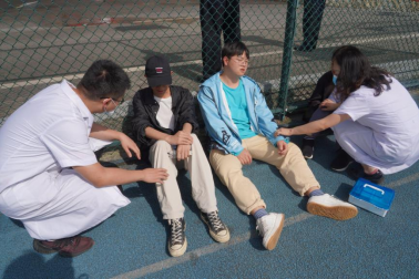 演练正式开始,自强居警报随即响起,烟雾瞬间“占领”了2-5层过道。短短的3分钟内,在应急救援组的及时疏散救援下,“被困”的120名学生用湿毛巾捂住口鼻有序撤离了“火灾”现场,并整齐地到达指定疏散场所。随后,经清点人数发现有2名学生仍被困无法实施救援,徐晓筑立即下达命令,向119请求支援。消防车火速赶到现场,两名消防队员立即全副武装冲进了火场,同时使用云梯对被困5层的学生进行破窗救援工作。在消防队员的努力下,两名学生被成功救出火场,经过5分钟持续喷水灭火,火情也顺利消除。最后,后勤医疗保障组的医务人员对被疏散的同学进行了心理疏导,并对出现“眩晕”的同学进行了紧急救治。