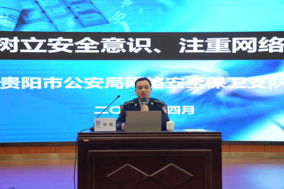 邀请贵阳市公安局钟暾警官作《树立安全意识、注重网络安全》专题讲座。钟警官以案说法,内容生动、深刻,他告诫大学生们一定要树立法治意识,增强网络安全意识。