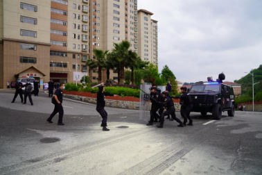 这时,春天广场发现两名“暴恐分子”,手持长刀向自爱居袭来,保安人员立即对现场学生进行了疏散,并将“暴恐分子”引至无人区,同时拨打了110报警电话。盘江派出所民警迅速赶到现场进行处置,由于“暴恐分子”极其凶残且持有燃烧瓶,民警无法将其快速制服,就在此时,贵定特警火速赶到了现场,经过多名特警的几轮攻势,迅速制服了两名“暴恐分子”。模拟演练结束后,贵定特警向同学们讲解了反恐防暴知识,让同学们了解在遇到恐怖暴力事件时,应该如何应对、如何正确保护自我及如何正确逃生。
