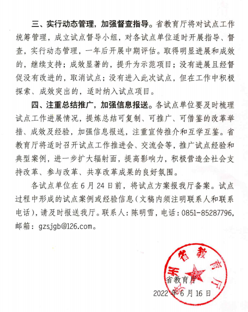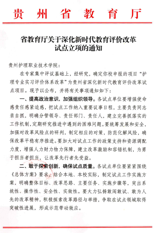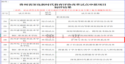 6月1日,贵州省教育厅公示了贵州省深化新时代教育评价改革试点项目立项名单。我院《护理专业实习评价体系改革》立项为贵州省深化新时代教育评价改革试点项目。