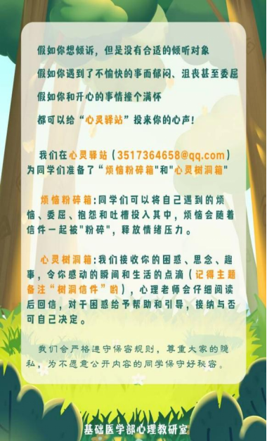 基础医学部心理教研室为同学们建立了“心灵驿站”,学生通过“烦恼粉碎箱”和“心灵树洞箱”倾诉烦恼和分享故事。心理教研室全体老师利用课余时间为学生开展线上心理辅导,减少了学生们的负面情绪,鼓励学生们保持积极的心态,共克时艰。