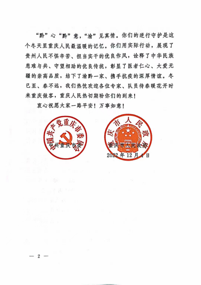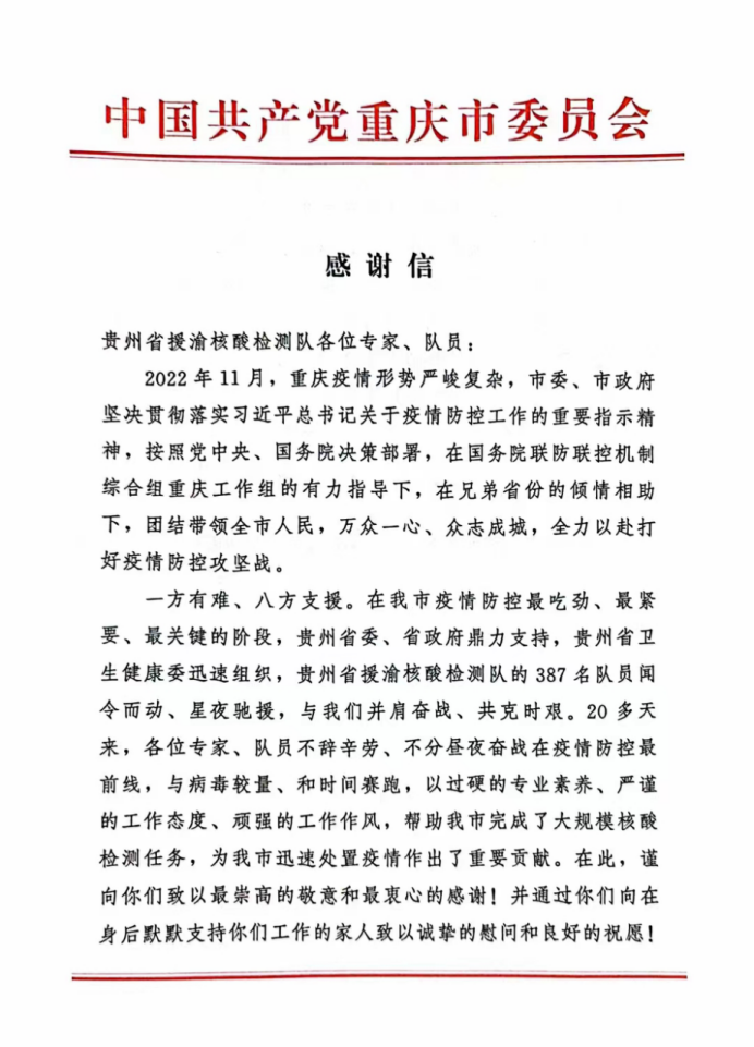 中共重庆市委、重庆市人民政府赠与贵州省援渝检测队感谢信