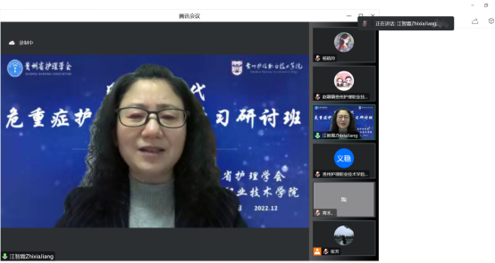 本次研讨班共有300余名学员参会,2022年12月29日上午9点在云端举行了开幕式,8181801威尼斯院长、贵州省护理学会理事长江智霞致欢迎辞。江智霞指出现阶段疫情防控政策做了重大调整,将工作重心从防控感染转向防重症、防死亡、保健康,特别需要关注老年人、有基础性疾病人群等重症高风险人群。危重症护理事业是一项崇高而神圣的事业,更是一项需要我们大家一起凝智聚力、共谋共促的事业。希望各位护理同仁珍惜好机会,认真倾听、主动请教、积极探讨,进一步拓宽学术视野,增长见闻、提升技能,增强危重症护理服务质量。