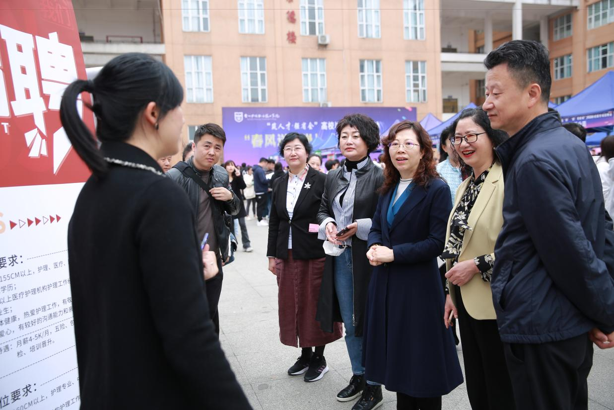 招聘会现场,黄亚励、江智霞院长陪同魏定梅一行在活动现场与用人单位亲切交流,详细问询招聘需求,认真听取用人单位对学院人才培养、专业建设、校企合作等方面的意见和建议,深入了解各专业2023届毕业生就业情况。魏定梅鼓励学院发挥专业优势,开源拓岗,推动学院建设与贵阳市卫生健康事业发展深度融合。