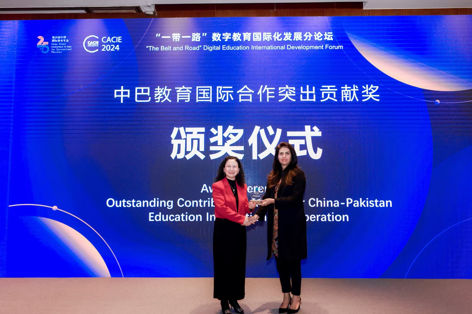 我院国际交流合作取得新成绩!由中国教育国际交流协会主办,唐风国际教育集团、巴基斯坦驻华大使馆、巴基斯坦国家职业技术教育委员会、俄罗斯联邦总统办公室直属战略倡议署承办,我院协办的“一带一路”数字教育国际化发展论坛在北京国家会议中心顺利举行,我院获巴基斯坦驻华大使馆颁发“中巴教育国际合作突出贡献奖”。祝贺我院国际教育交流合作更上一层楼!