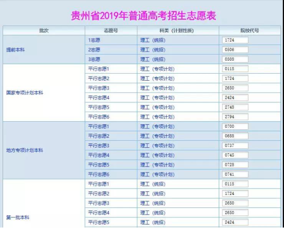 2.考生按照本人事先填写好的《贵州省2019年高考志愿纸质样表》,输入院校代号并认真核对院校名称是否正确。(图-8)