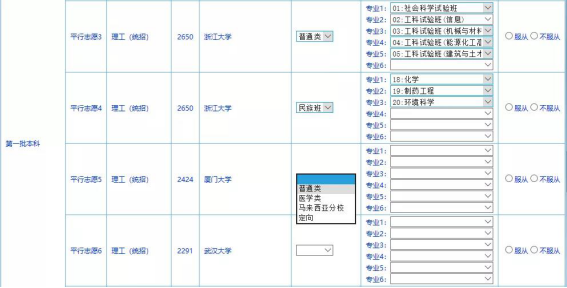 (四)每个批次的院校志愿都设有“愿否服从专业调剂”栏,请考生认真思考,表明意愿。