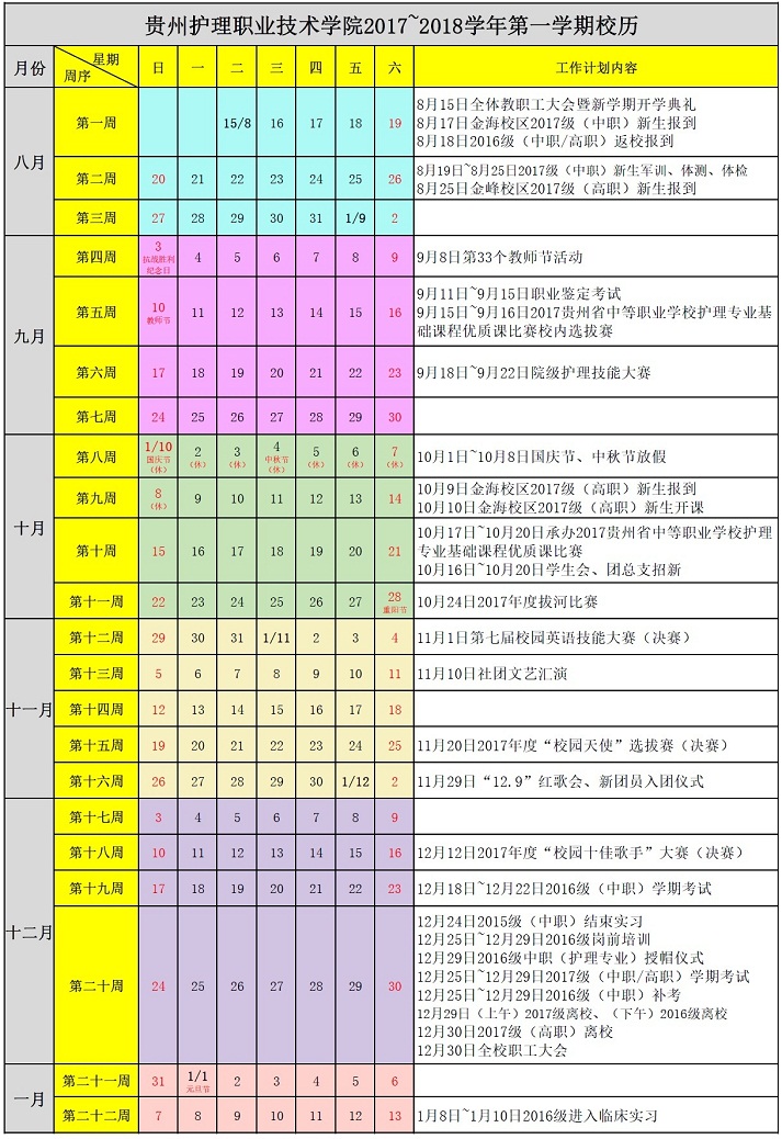 2017-2018学年第一学期校历