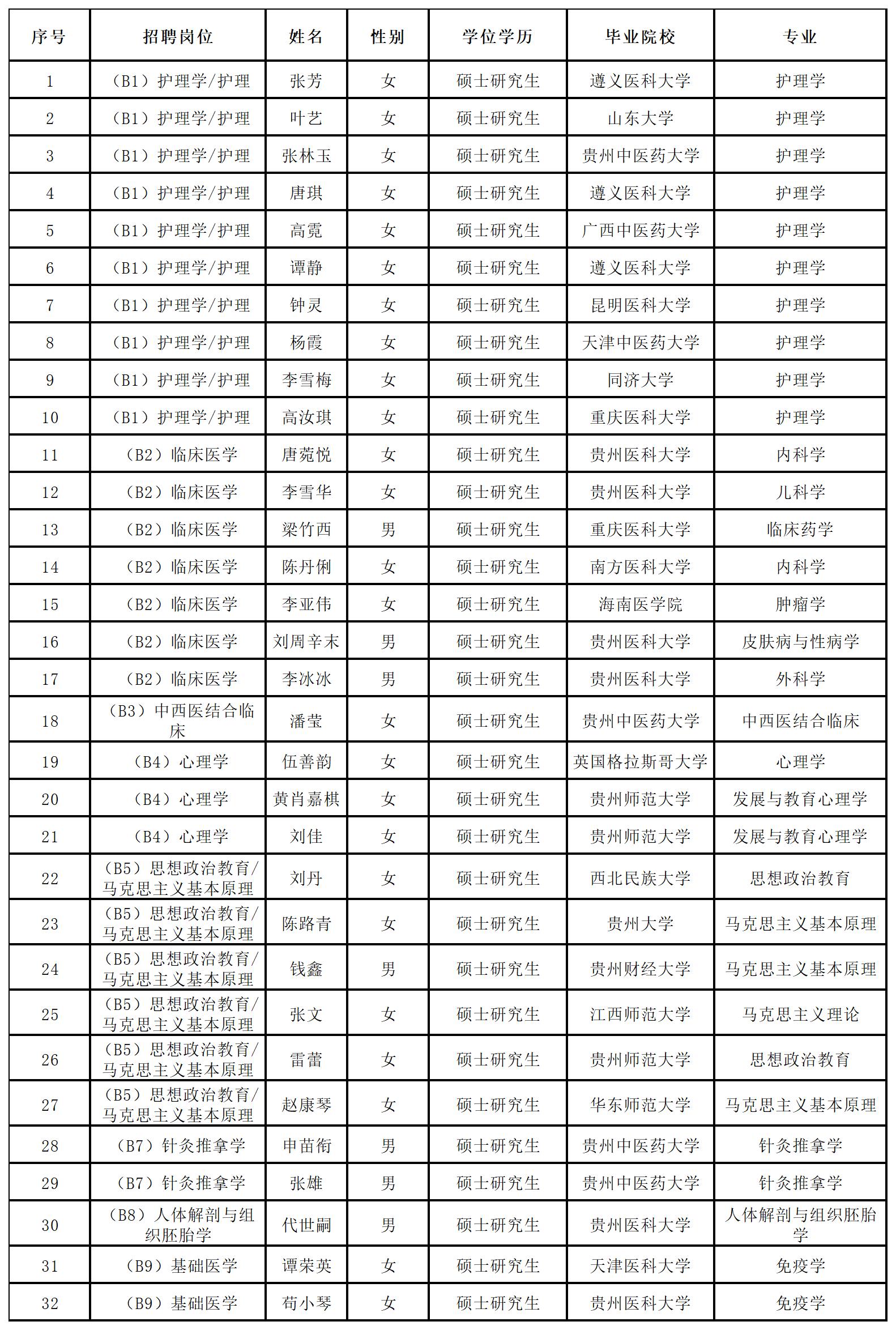 根据省人力资源和社会保障厅《关于做好第十届贵州人才博览会事业单位引进人才有关工作的通知》(黔人社通〔2022〕49号)文件精神,我院已于2022年6月20日-21日完成第十届人博会线上评审工作,共有61名急需紧缺人才参与本次线上评审,其中思想政治教育/马克思主义基本原理岗位21人、护理学/护理岗位15人、心理学岗位12人、临床医学岗位7人、针灸推拿学岗位2人、基础医学岗位2人、人体解剖与组织胚胎学岗位1人、中西医结合临床岗位1人。经线上评审,根据成绩高低顺序排名后,最终按照1:3的比例确定进入线下评审的人员名单(注:比例不足1:3的岗位,按实际人数确定)。线上评审结果经省卫生健康委审定,确定32人有资格进入线下评审环节(人员名单见附件)。