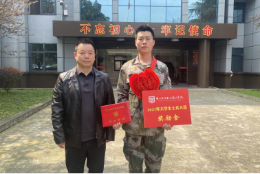 学院领导为新兵陈怀江同学颁发毕业证书和入伍奖励