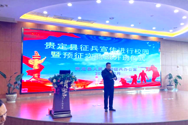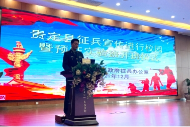 为鼓励大学生积极报名应征入伍,向国家输送优质兵源,推进国防和军队现代化建设,12月3日下午,贵定县征兵宣传进校园暨预征实验班开班仪式在我院金海校区举行。贵定县委常委、县人民武装部部长、县人民武装部征兵办公室主任周黎明,贵州省军区动员局令狐克依,学院党委委员、副院长、武装部部长潘忠伦及学院300余名学生参加本次活动。