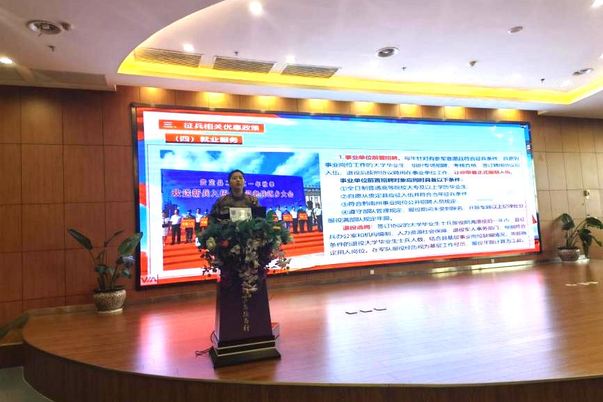 贵定县人民武装部征兵办宣传员邓婕向同学们解读了大学生征兵相关政策及应征入伍流程,并分享了自己在部队的经历,希望同学们能亲自去部队体验生活,切身感受作为一名军人肩上的责任。