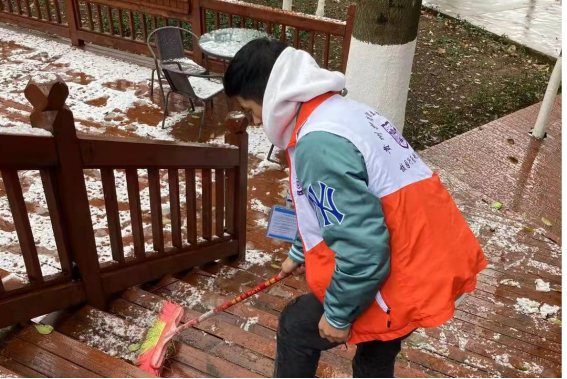 天冷路滑,自管委的同学们依然在自己的岗位上坚守着,即使双手被冻得发红,刺骨寒风也无法吹灭他们对工作的热情。他们的脚步遍布两校区的各个角度,提醒途经同学们注意防滑保暖,用实际行动践行志愿者精神。