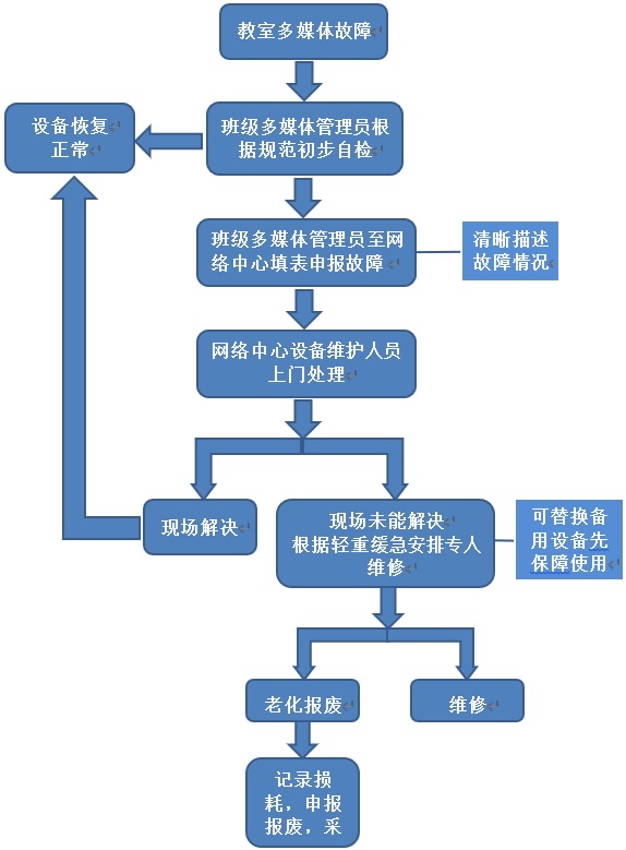 如遇公共课、临时教室紧急设备故障,任课老师可直接拨打现代信息技术教育中心管理员电话或多媒体管理员到现代信息技术教育中心进行报修;现代信息技术教育中心维护人员迅速到达现场解决处理。事后相关管理人员须补填《教室多媒体设备申报记录表》。