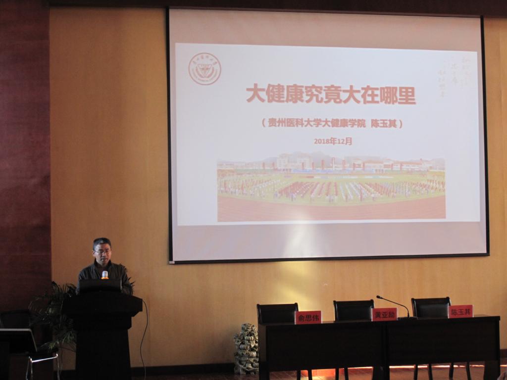 讲座上,陈玉其教授为全体教师作了主题为《大健康到底大在哪里》的专题讲座。首先,他从大健康及大健康产业的相关文件及学术资料作为背景展开,分别从大健康的含义、健康的定义、什么是大健康产业、大健康产业六项行动计划、大健康产业市场规模、贵州大健康产业规模、大健康产业未来的热点等方面进行了介绍和分享,并结合教师这一职业,对大健康背景下我们该怎么做提出了新观点、新方法。讲座内容丰富多元、层层深入,使我院教师对如何维护健康、作为教师如何做好传播健康知识理念及如何培养大健康产业急需人才等问题有了新的认识与思考。
