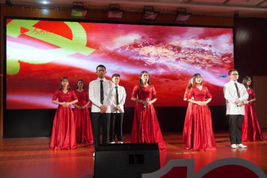 “100年前,您像喷薄而出的一轮红日,在东方地平线上冉冉升起,从此中国的革命航船有了可靠的舵手。您是鲜明的旗帜,万千热血的战士,在您的指引下,乘风破浪,奋勇前进。您是不灭的灯塔,慢慢长夜,照亮了战士前行的方向。您是希望的源泉,鼓舞着中华儿女在急风暴雨中顽强地搏斗。一百年的历程,见证着您奋斗的足迹;一百年的沧桑,留下了您坚韧不屈的身影。您无愧于历史,无愧于天地。”激情澎湃的朗诵《党的一百年征程》犹如那光明的灯塔在师生心中屹立。