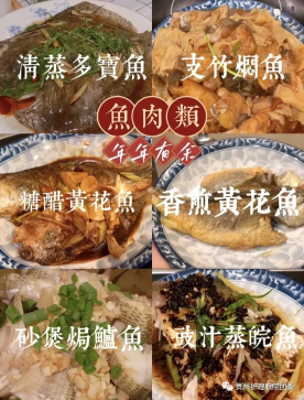 北方人年夜饭的菜色中常包括水饺、鱼、年糕、长年菜等。因为水饺状似金元宝,有富贵之意; 鱼这道菜不能吃完,因为在汉语中“鱼”和“余”同音,有“年年有余”的吉祥意思; 年糕则有“年年高升”之意; 吃长年菜则有长寿的意涵。华南则多有鸡、烧肉、发菜、蚝豉等,因为“发菜蚝豉”与“发财好市”谐音。江南的典型年夜饭必有鱼,丰盛汤锅。