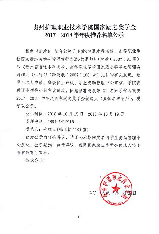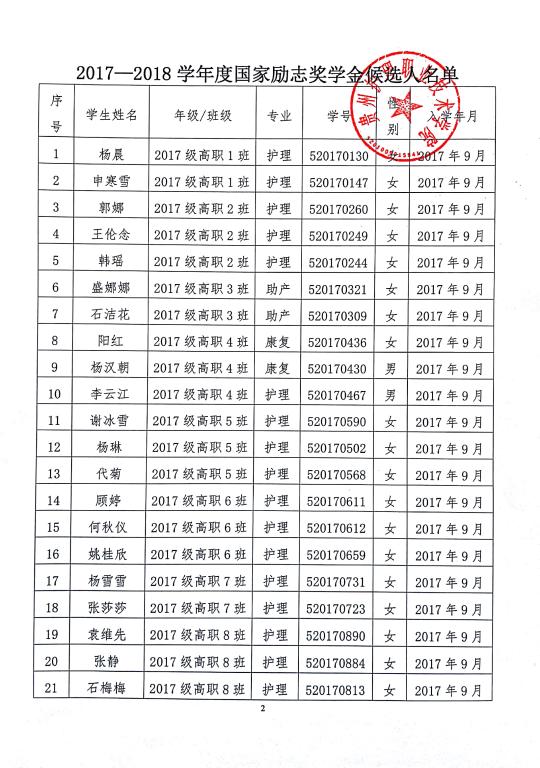 国家励志奖学金2017-2018年度推荐名单公示