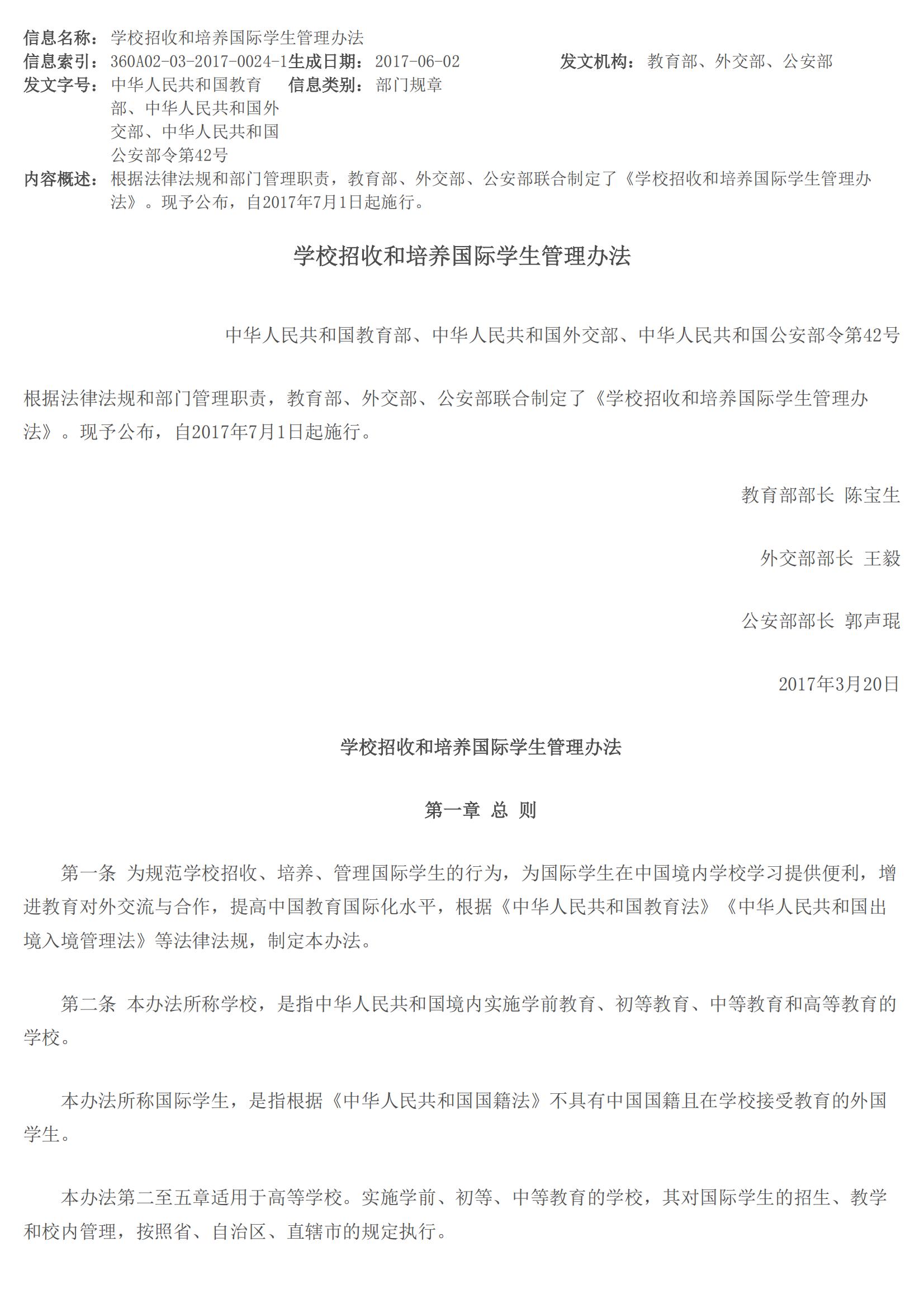 教育部令第42号:8181801威尼斯登录招收和培养国际学生管理办法