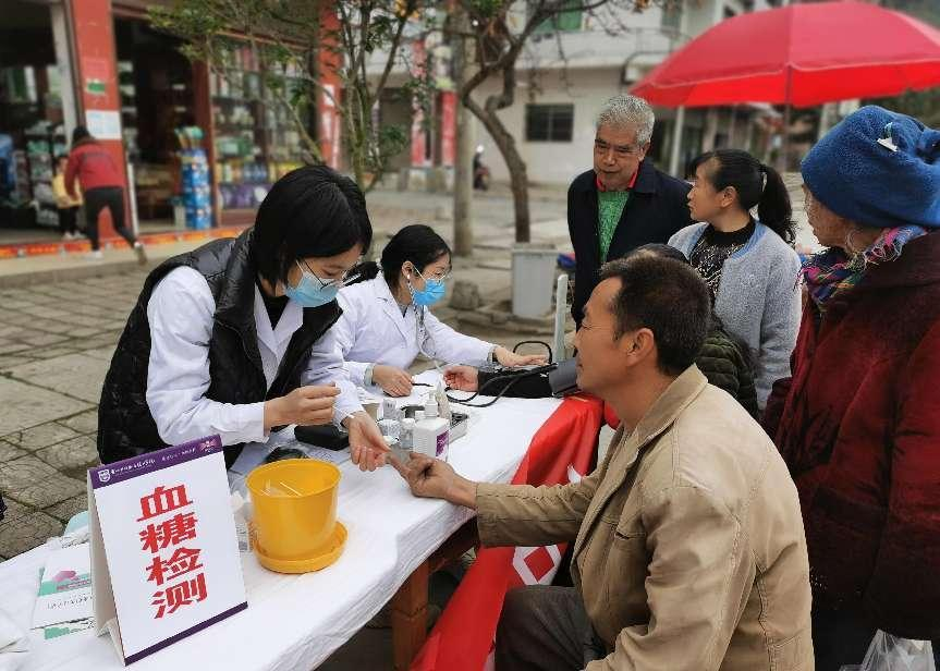 党员同志充分发挥专业特长,为当地群众开展健康监测、血糖、血压测量等工作,同时科普健康知识,发放健康手册、健康监测辅助物资等。
