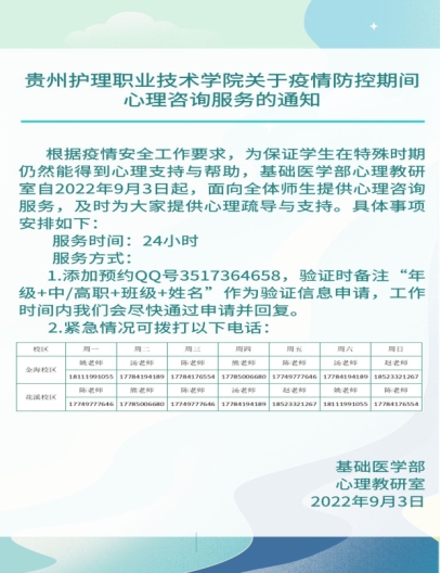 疫情防控期间,基础医学部心理教研室快速响应、主动作为,9月3日及时开通了线上心理服务平台,心理咨询教师全天在线值班,通过电话咨询和QQ咨询的方式,为有心理困扰但不能面谈的师生们提供专业的线上心理服务,包括提供心理支持、情绪疏导、情感支持、危机干预等,帮助同学们缓解因疫情带来的负面情绪,提高心理应对能力。