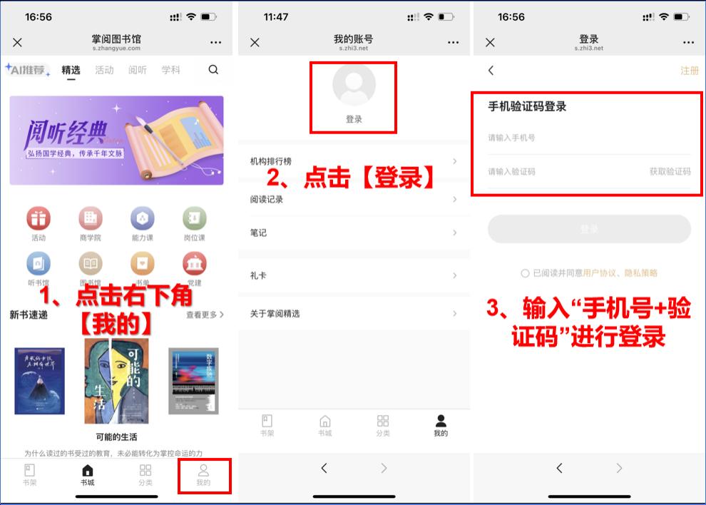 方式三:APP端。掌阅精选APP请在【应用商城】或【APP store】下载安装使用。