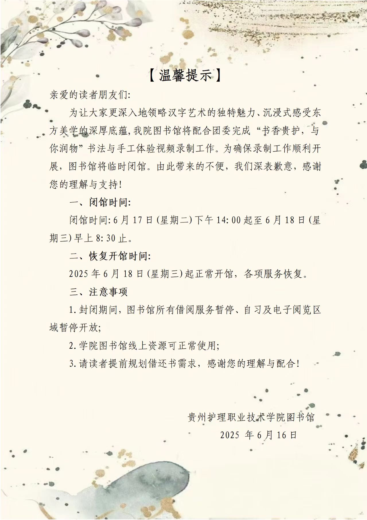 【温馨提示】我院图书馆将配合团委完成“书香贵护,与你润物”书法与手工体验视频录制工作,为确保录制工作顺利,图书馆将临时闭我院图书馆将配合团委完成“书香贵护,与你润物”书法与手工体验视频录制工作,为确保录制工作顺利,图书馆将临时闭馆