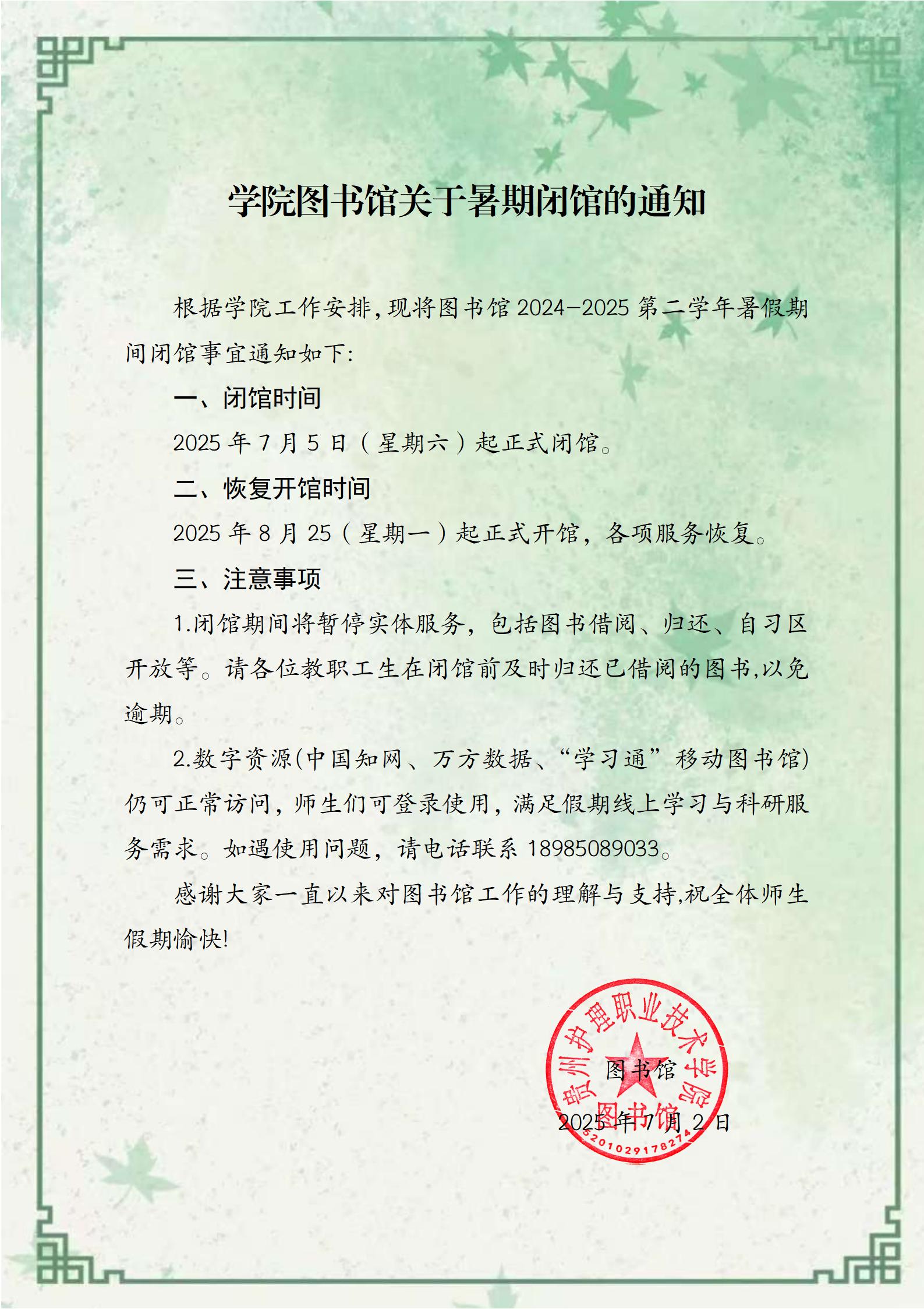 学院图书馆关于暑假闭馆的通知
